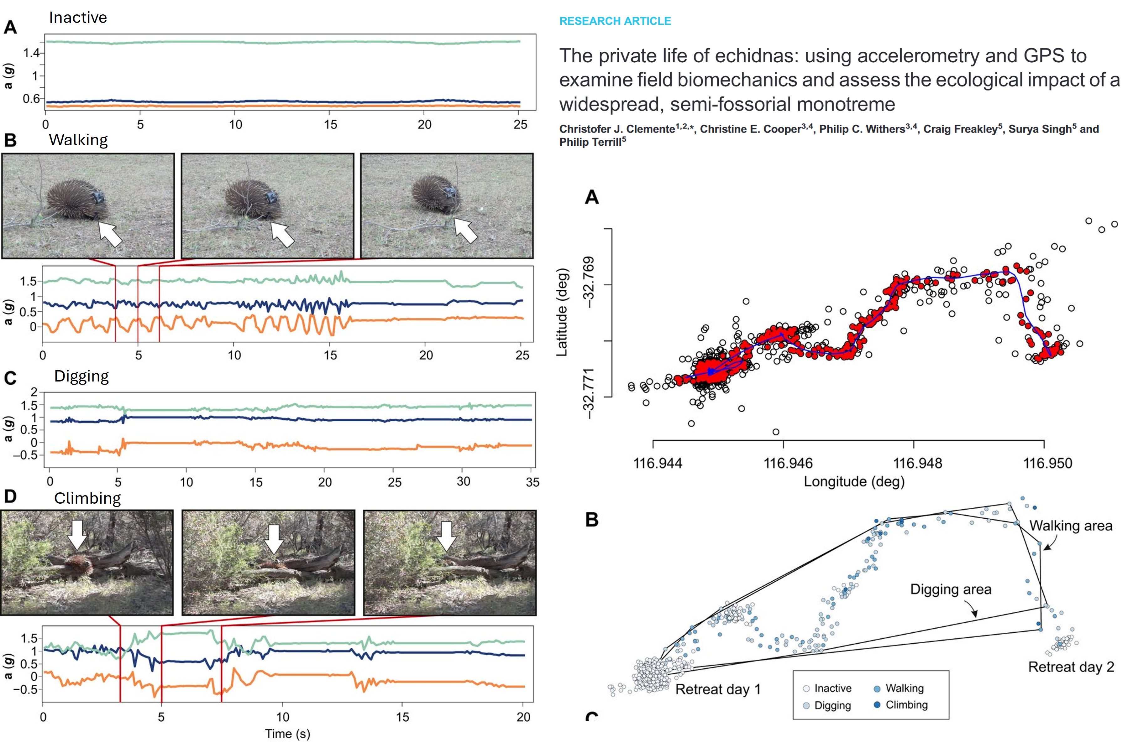 Accelerometers: A logger that measures linear and angular acceleration in three axes (same tech in your smart watches and phones). Data from accelerometers can be used for monitoring activity levels, classify bahviours (foraging, resting, hunting), and estimate energy expenditure, such as overall dynamic body acceleration (ODBA). The challenge of accelerometers is that they require calibration of known behaviours (e.g. in the lab or controlled setting) to infer behaviour in the wild, and also accelerometers do not have location data, so the integration of GPS of VHF telemtry is required to link behavour with space use.