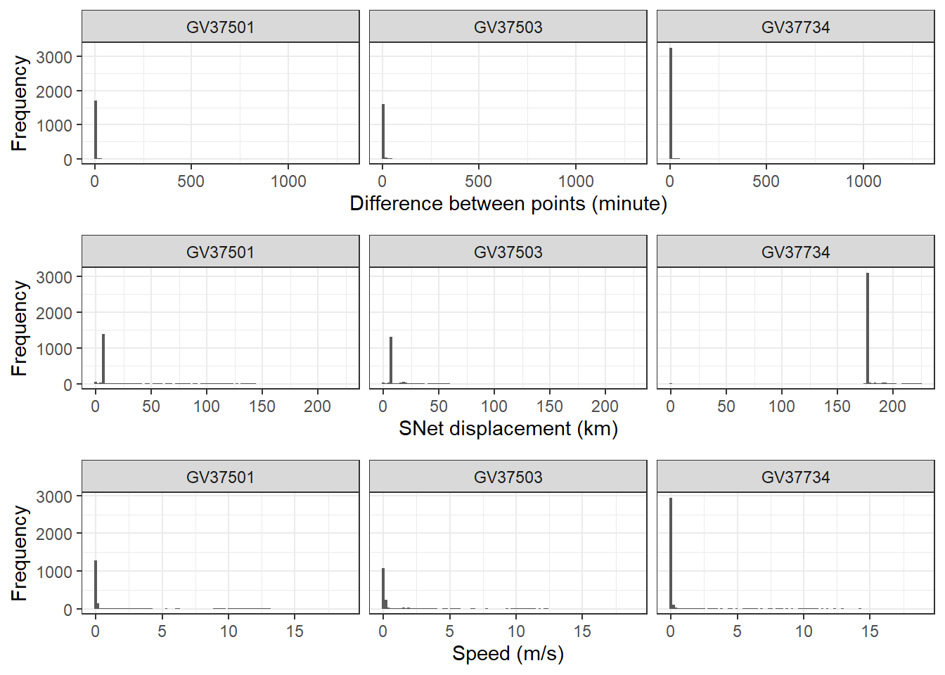labs(x = "SNet displacement (km)", y = "Frequency") +