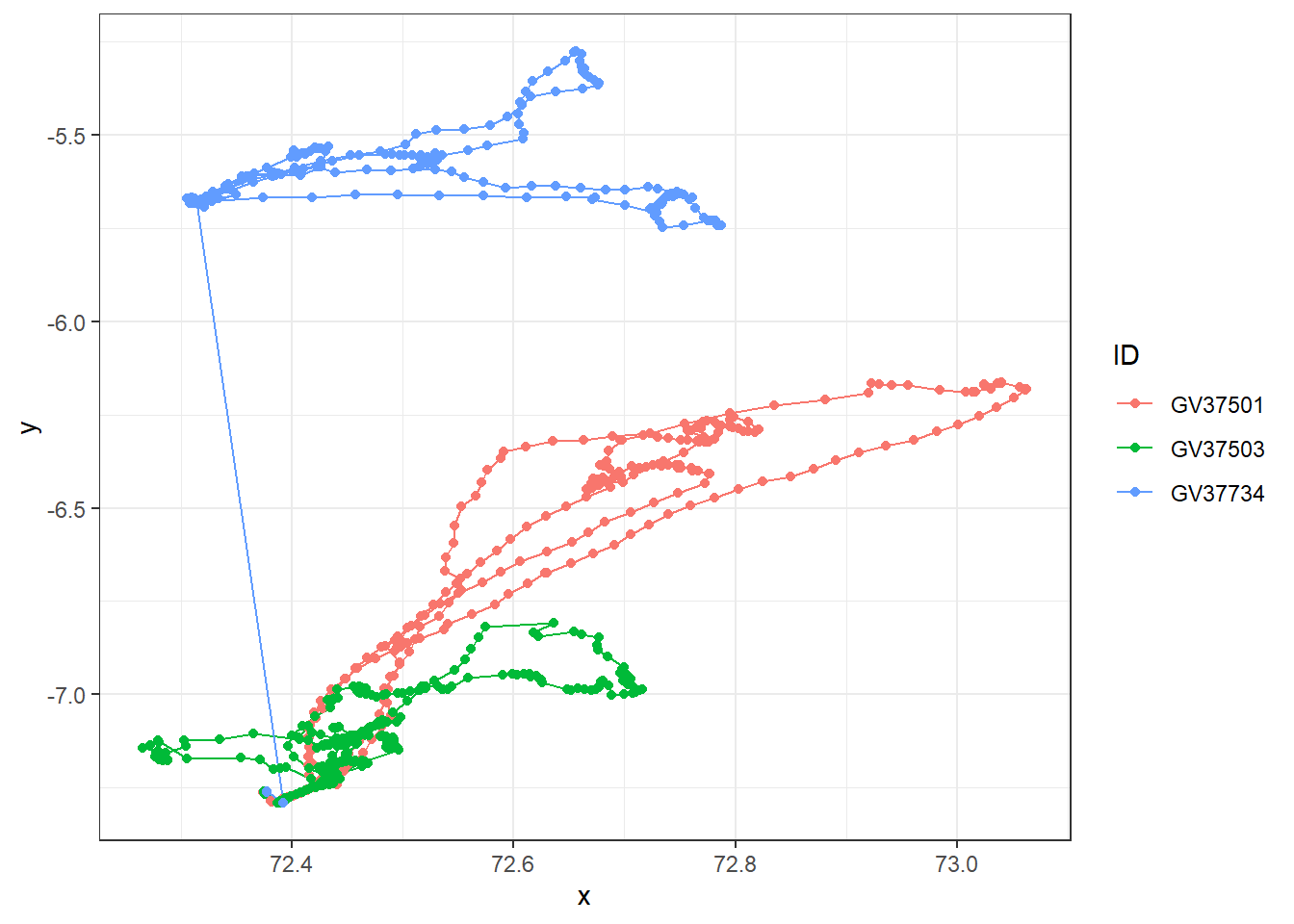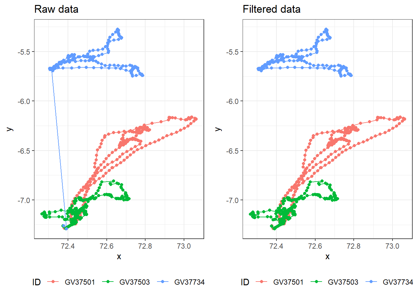 netdisp <= filter_netdisp) # keep distances less than net displacement filter (here is 300 km)Have a look at the filtered data using ggplot and compare with the original raw data.