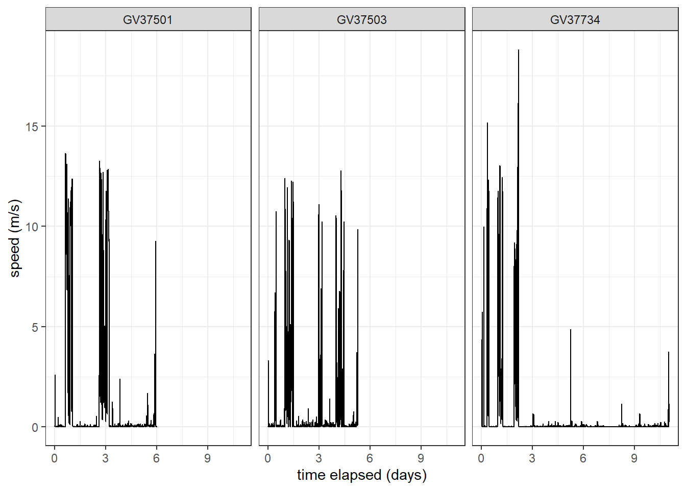 mutate(across(c(dist, speed, Lat, Lon), as.numeric))Create a time series plot of speed, faceted for each individual.