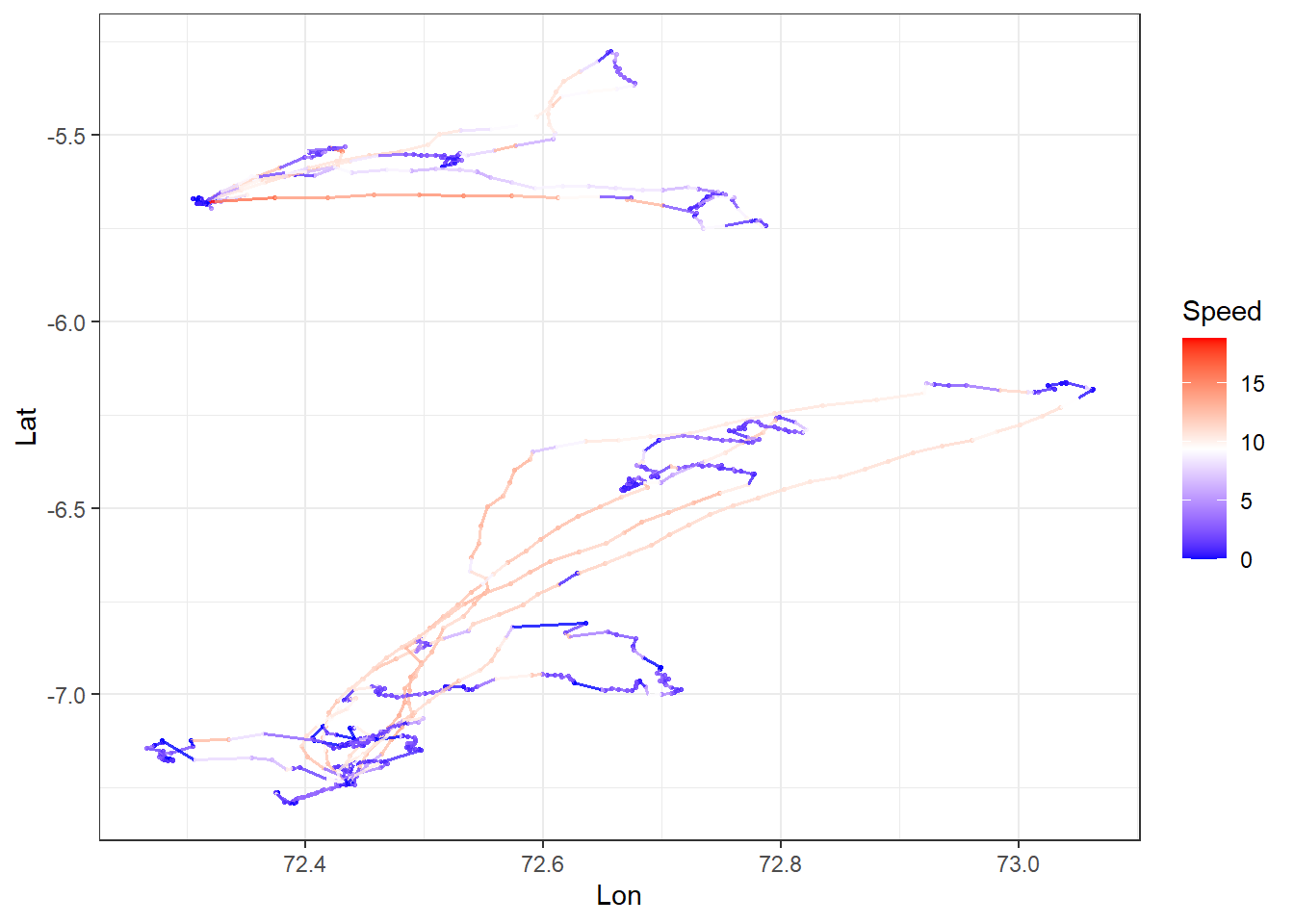 geom_path(aes(x = Lon, y = Lat, col = speed, group = ID),