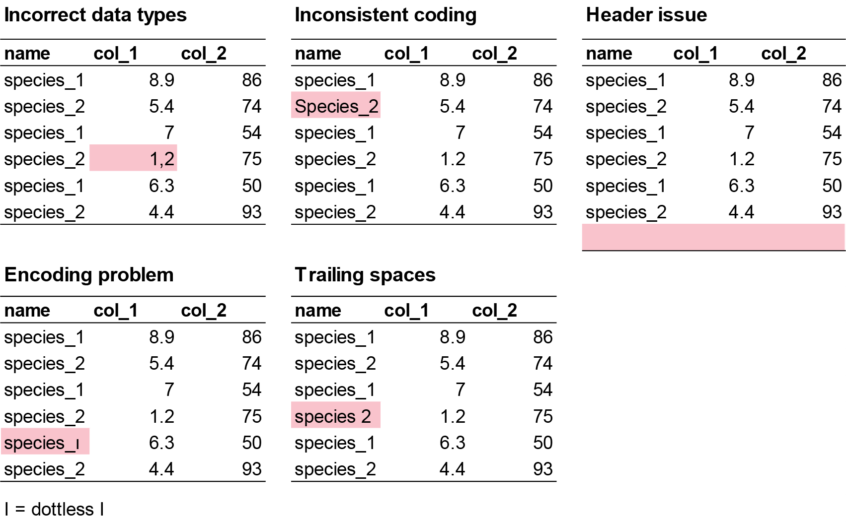 To make it a bit easier for you, I have given you hints where the errors are so you dont have to look through every single column or every problem. But in your own dataset, you will need to thoroughly check your own data in the future.