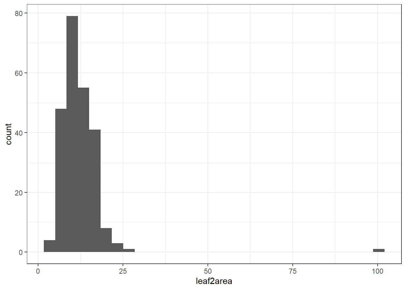 Let’s check the distribution of leaf2area after removing that one outlier.
