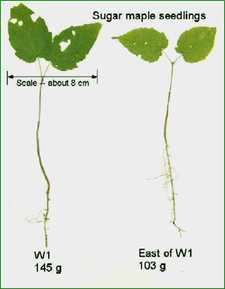 Growth of sugar maples (Acer saccharum), known for their maple syrup and iconic leaf shape, can be stunted due to soil acidification from prolonged acid rain, which leaches calcium - a nutrient important for plant growth - from soils and stresses maple seedlings.