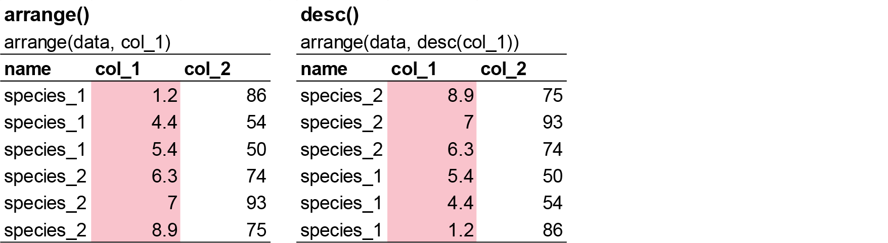 arrange(). e.g. rearrange a numeric column by the largest values. - Pick variables by their names