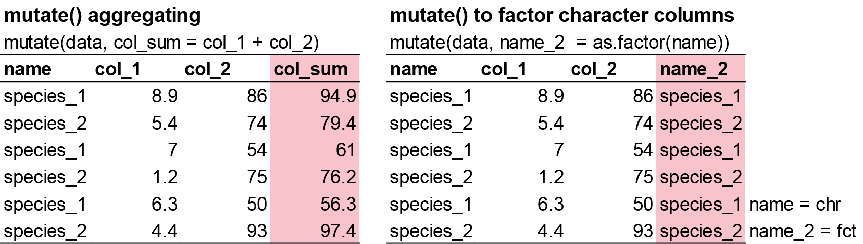 mutate(). e.g. the sum of values from two numeric columns. - Collapse many values down to a single summary