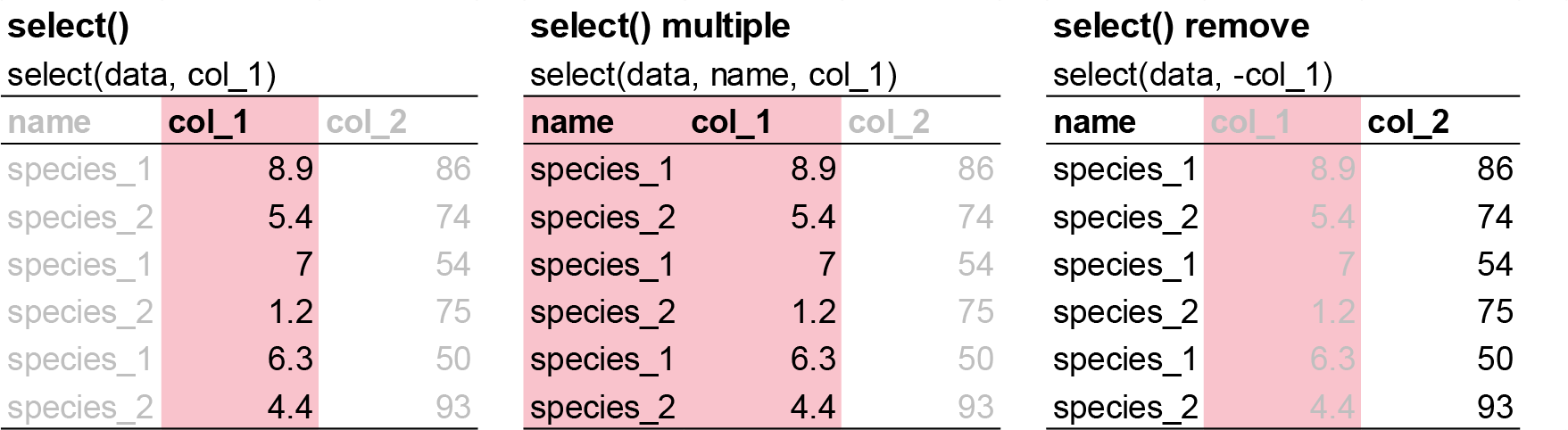 select(). e.g. keeping selected columns only. - Create new variables with functions of existing variables