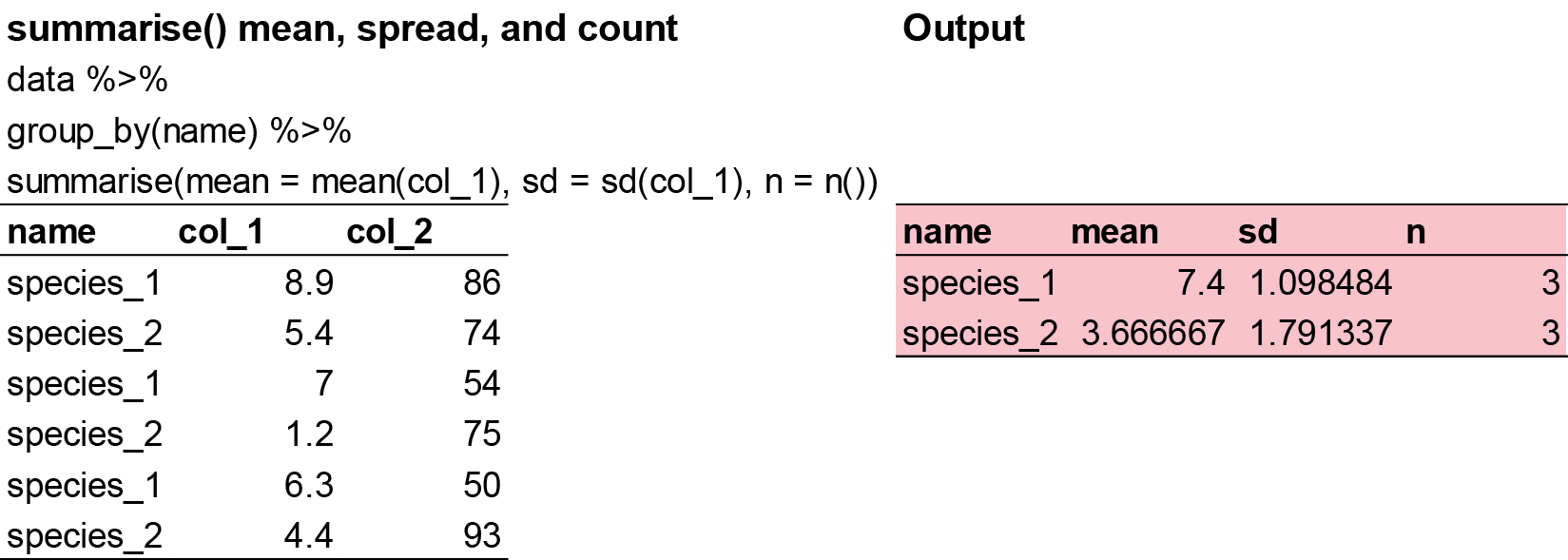 summarise(mean = mean(species, na.rm = TRUE))That’s because aggregation functions obey the usual rule of missing values: if there’s any missing value in the input, the output will be a missing value. Fortunately, all aggregation functions have an na.rm argument which removes the missing values prior to computation. If your dataset has NAs, the na.rm = TRUE argument will be helpful.