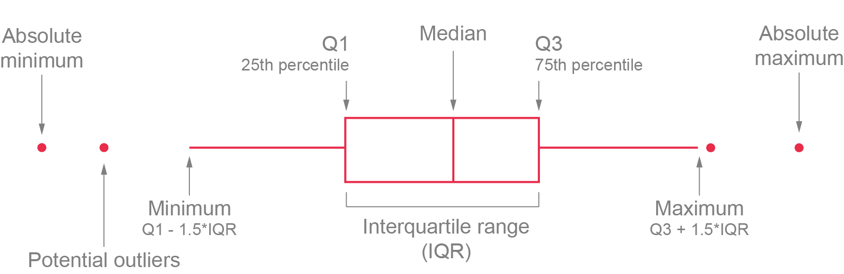 Whiskers: The lines extending from the box show the range of values within Q3 + 1.5 × IQR to Q1 - 1.5 × IQR, representing the highest and lowest values, excluding outliers.