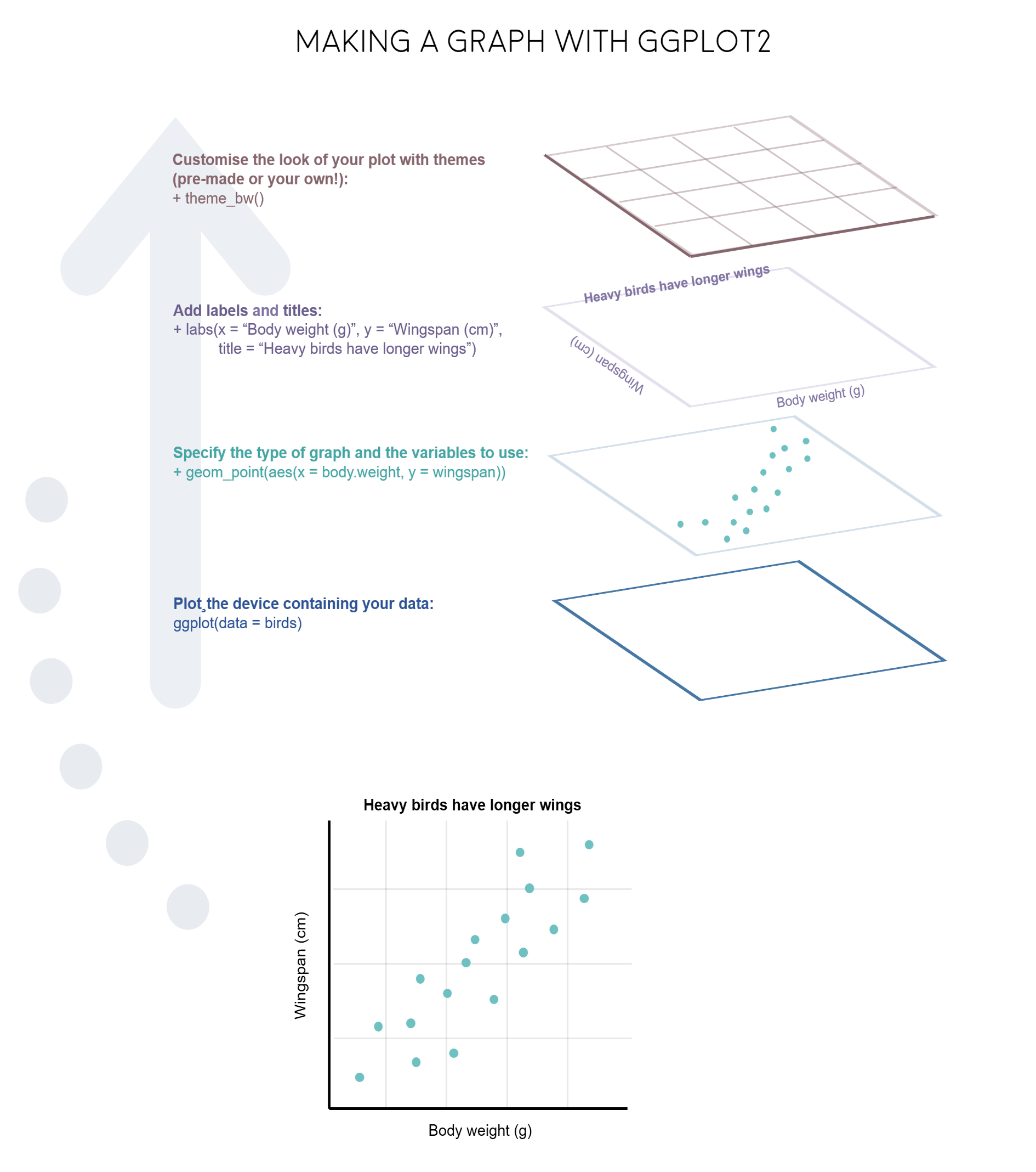 The gg in ggplot2 stands for grammar of graphics. Writing the code for your graph is like constructing a sentence made up of different parts that logically follow from one another. In a more visual way, it means adding layers that take care of different elements of the plot. Your plotting workflow will therefore be something like creating an empty plot, adding a layer with your data points, then your measure of uncertainty, the axis labels, and so on.