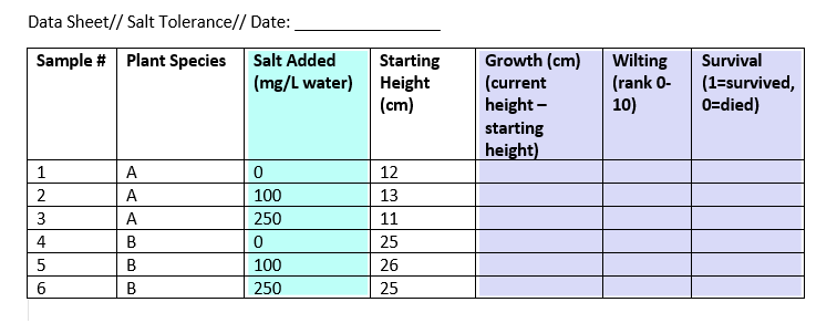 In this example experiment data sheet, we have one independent and three dependent variables.