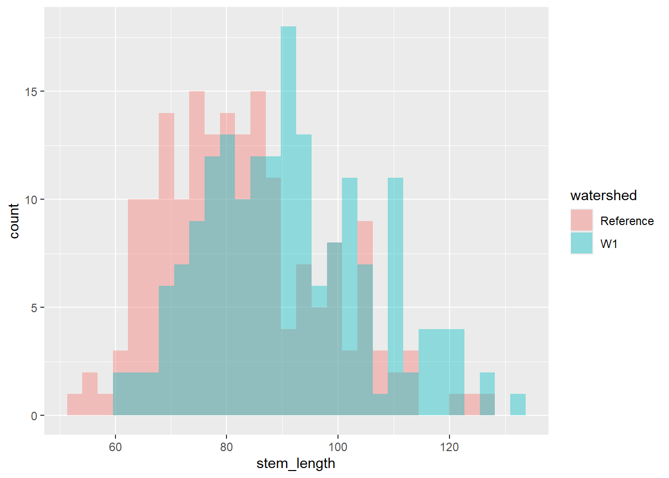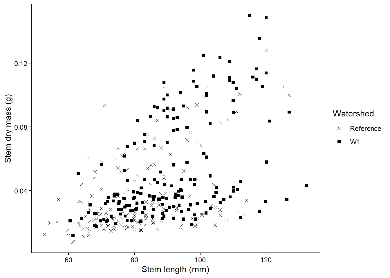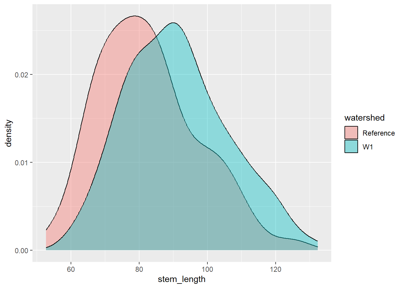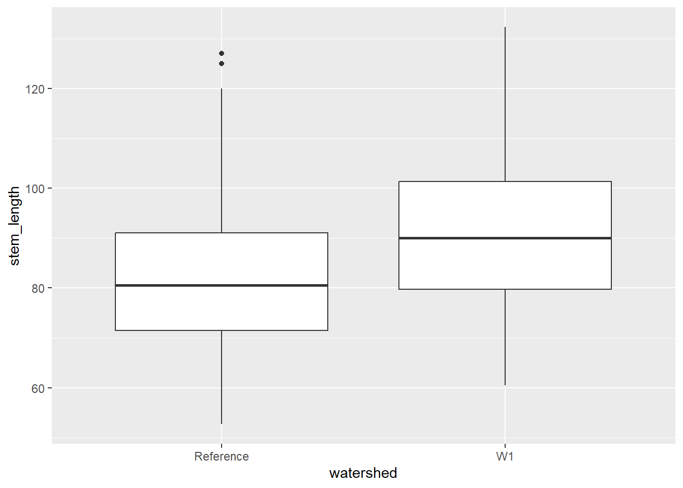 Let’s say we are interested in visualising at differences in stem length in calcium-treated (W1) versus untreated (Reference) watersheds, there are a couple of ways we can visualise this.