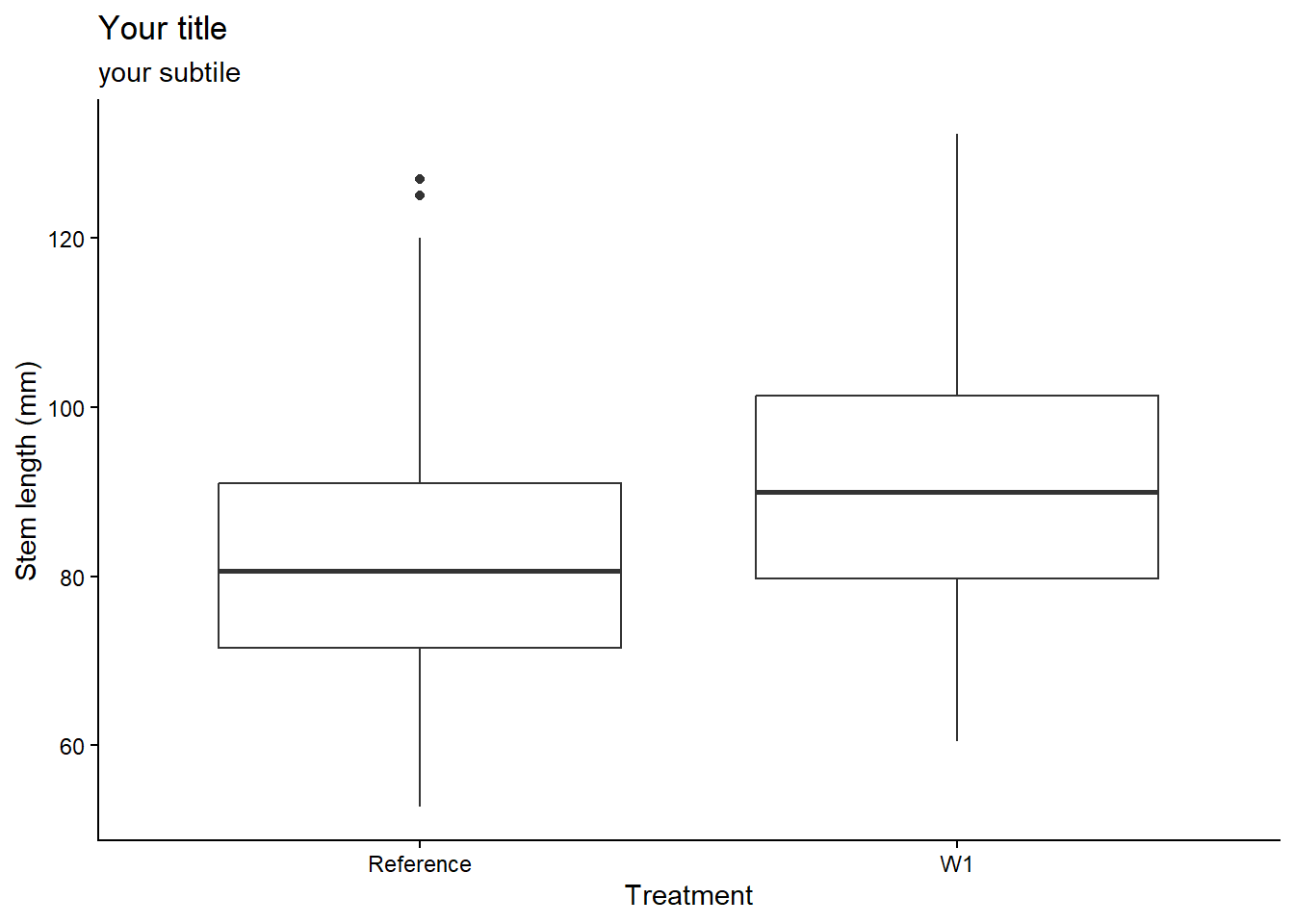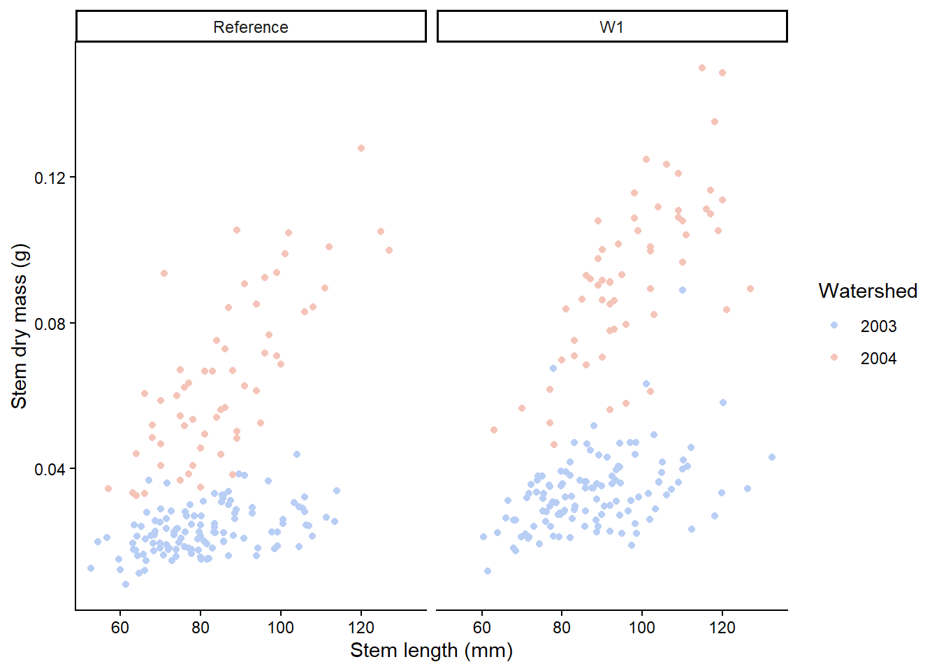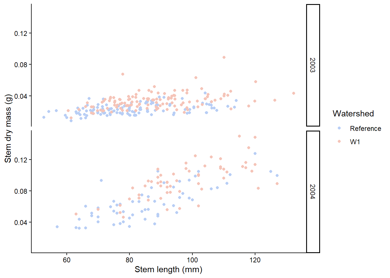 Let’s say we are interested in visualising at differences in stem length in calcium-treated (W1) versus untreated (Reference) watersheds, there are a couple of ways we can visualise this.