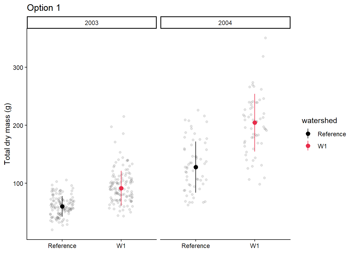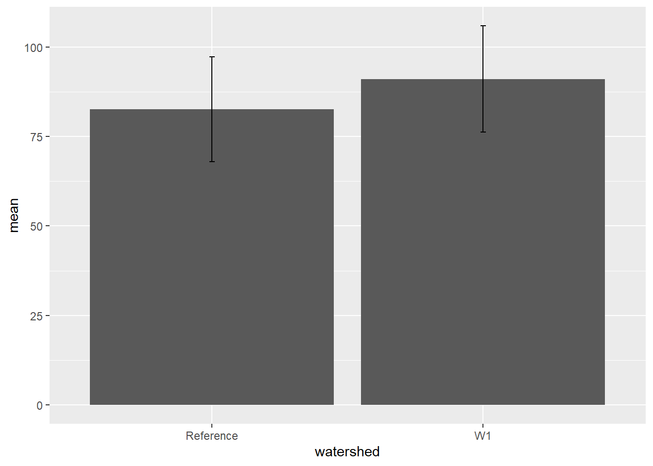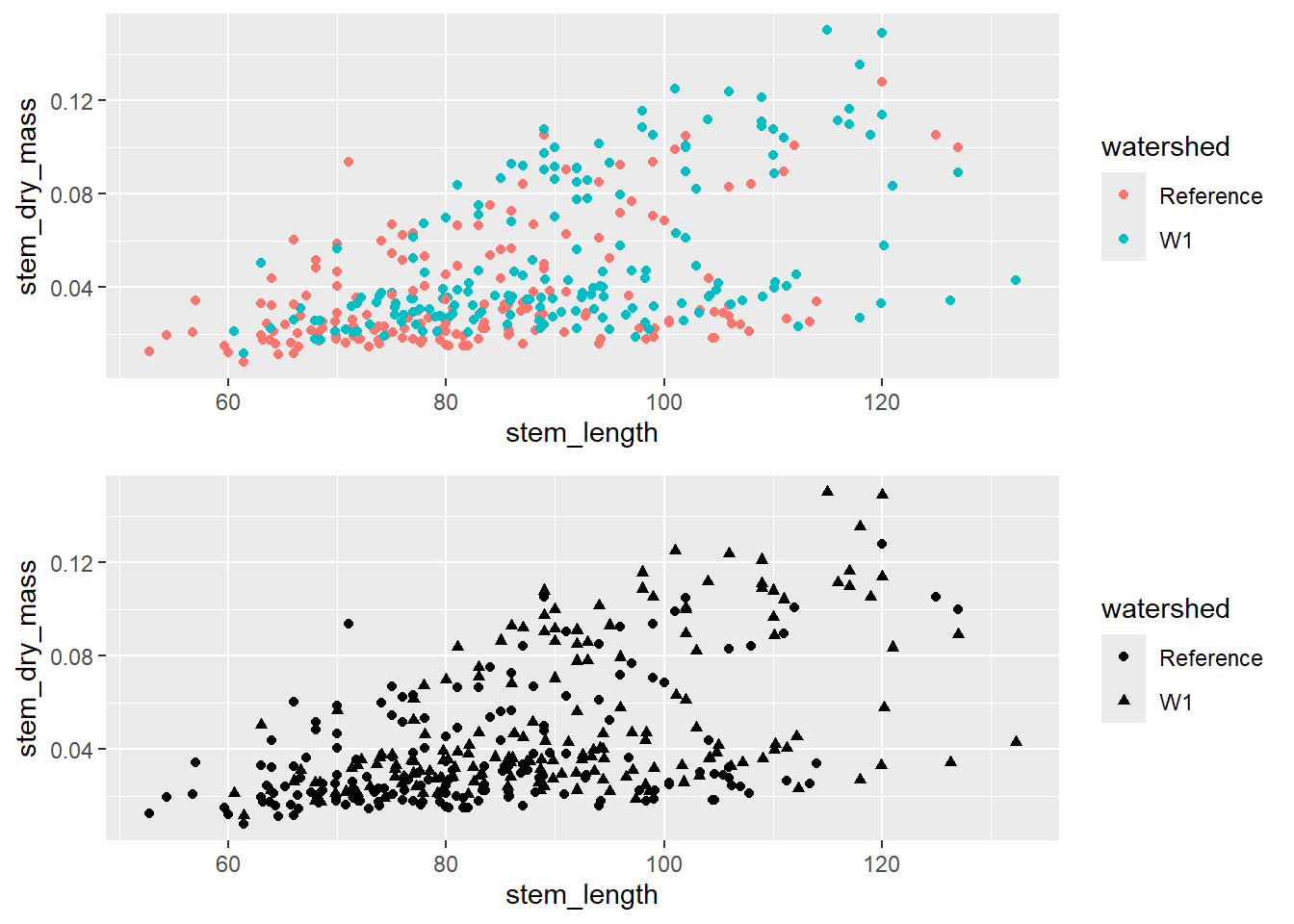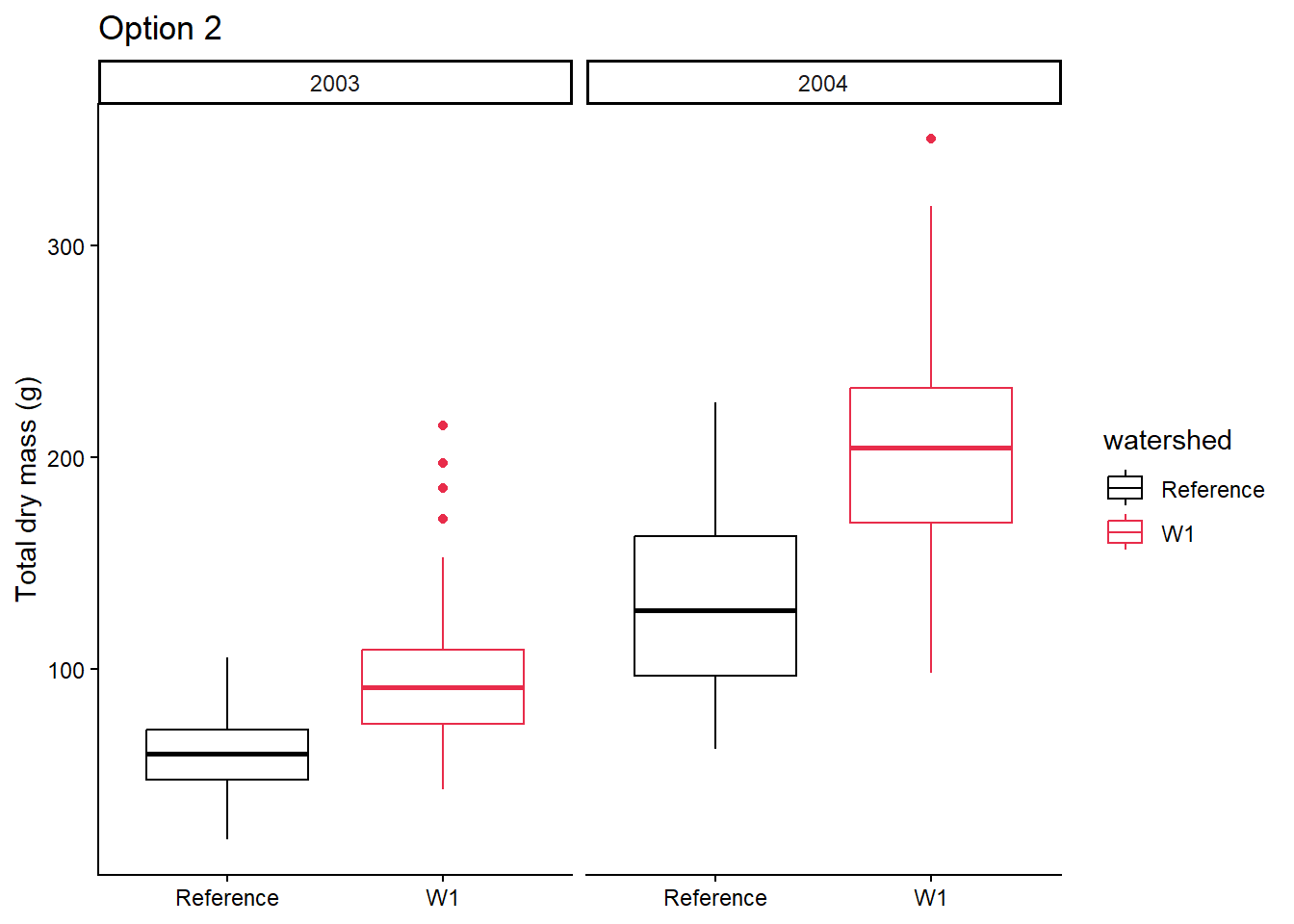 Let’s say we are interested in visualising at differences in stem length in calcium-treated (W1) versus untreated (Reference) watersheds, there are a couple of ways we can visualise this.