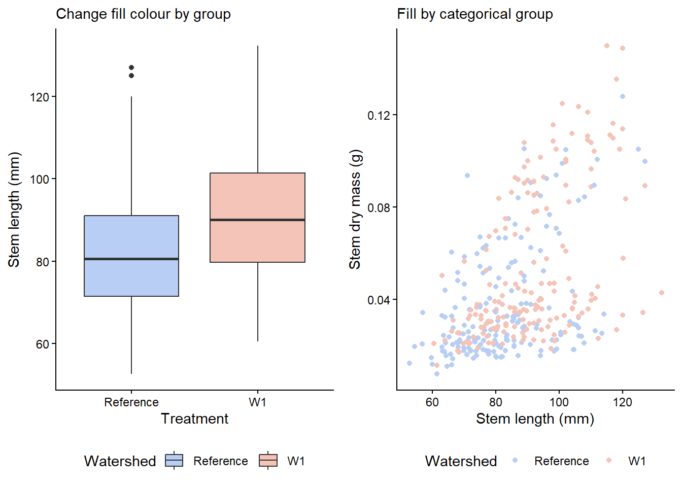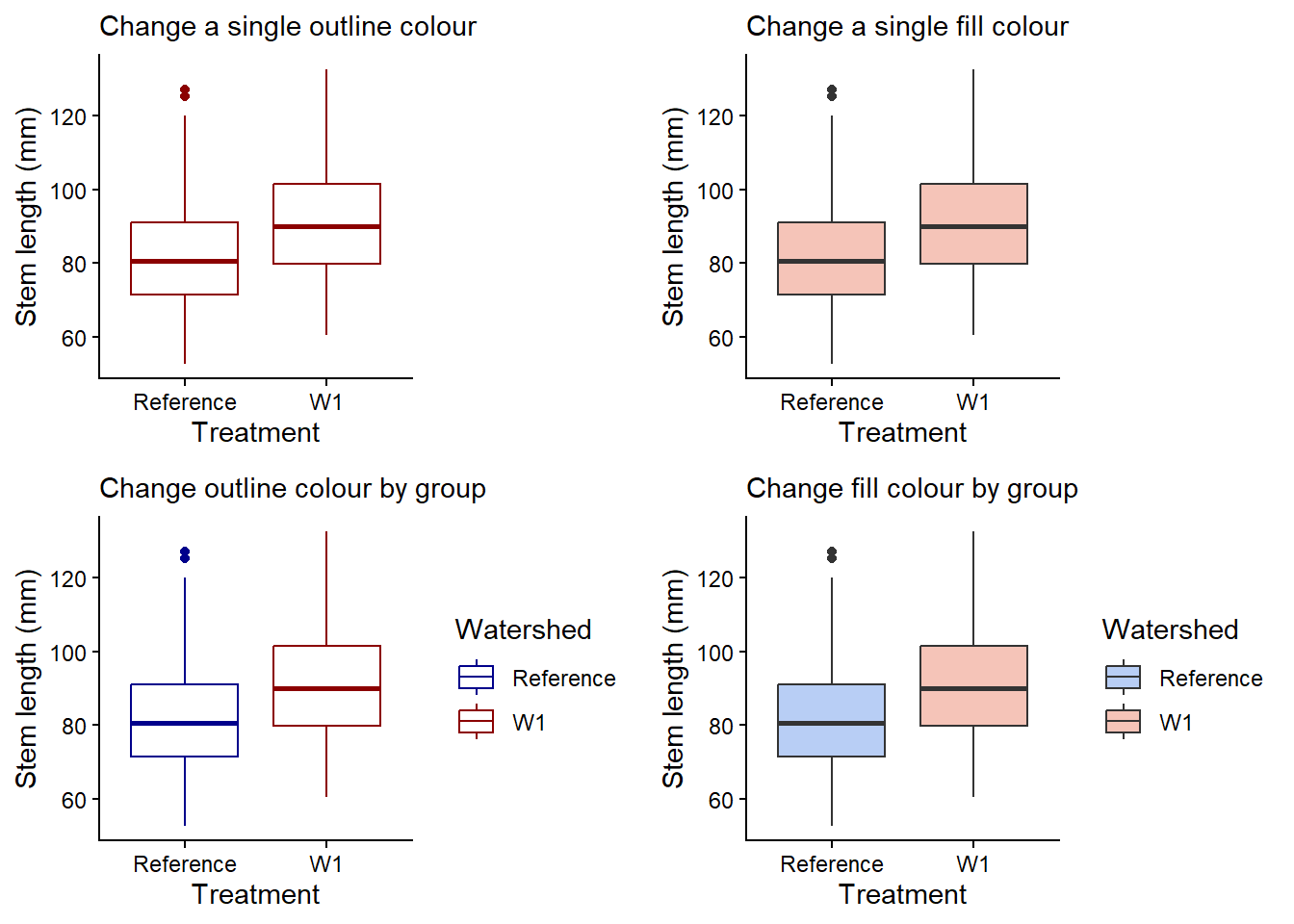 single_colour <- plant_task_clean_data %>%ggplot(aes(x = watershed, y = stem_length)) +geom_boxplot(colour ="darkred") +# Modify herelabs(subtitle ="Change a single outline colour",x ="Treatment", y ="Stem length (mm)") +theme_classic()single_fill <- plant_task_clean_data %>%ggplot(aes(x = watershed, y = stem_length)) +geom_boxplot(fill ="#F5C4B8") +# Modify herelabs(subtitle ="Change a single fill colour",x ="Treatment", y ="Stem length (mm)") +theme_classic()group_colour <- plant_task_clean_data %>%ggplot(aes(x = watershed, y = stem_length, colour = watershed)) +# Modify heregeom_boxplot() +# Modify herescale_color_manual(values =c("darkblue", "darkred")) +labs(subtitle ="Change outline colour by group",x ="Treatment", y ="Stem length (mm)",colour ="Watershed") +theme_classic()group_fill <- plant_task_clean_data %>%ggplot(aes(x = watershed, y = stem_length, fill = watershed)) +# Modify heregeom_boxplot() +# Modify herescale_fill_manual(values =c("#B8CEF5", "#F5C4B8")) +labs(subtitle ="Change fill colour by group",x ="Treatment", y ="Stem length (mm)",fill ="Watershed") +theme_classic()cowplot::plot_grid(single_colour, single_fill, group_colour, group_fill, ncol =2, align ="v")