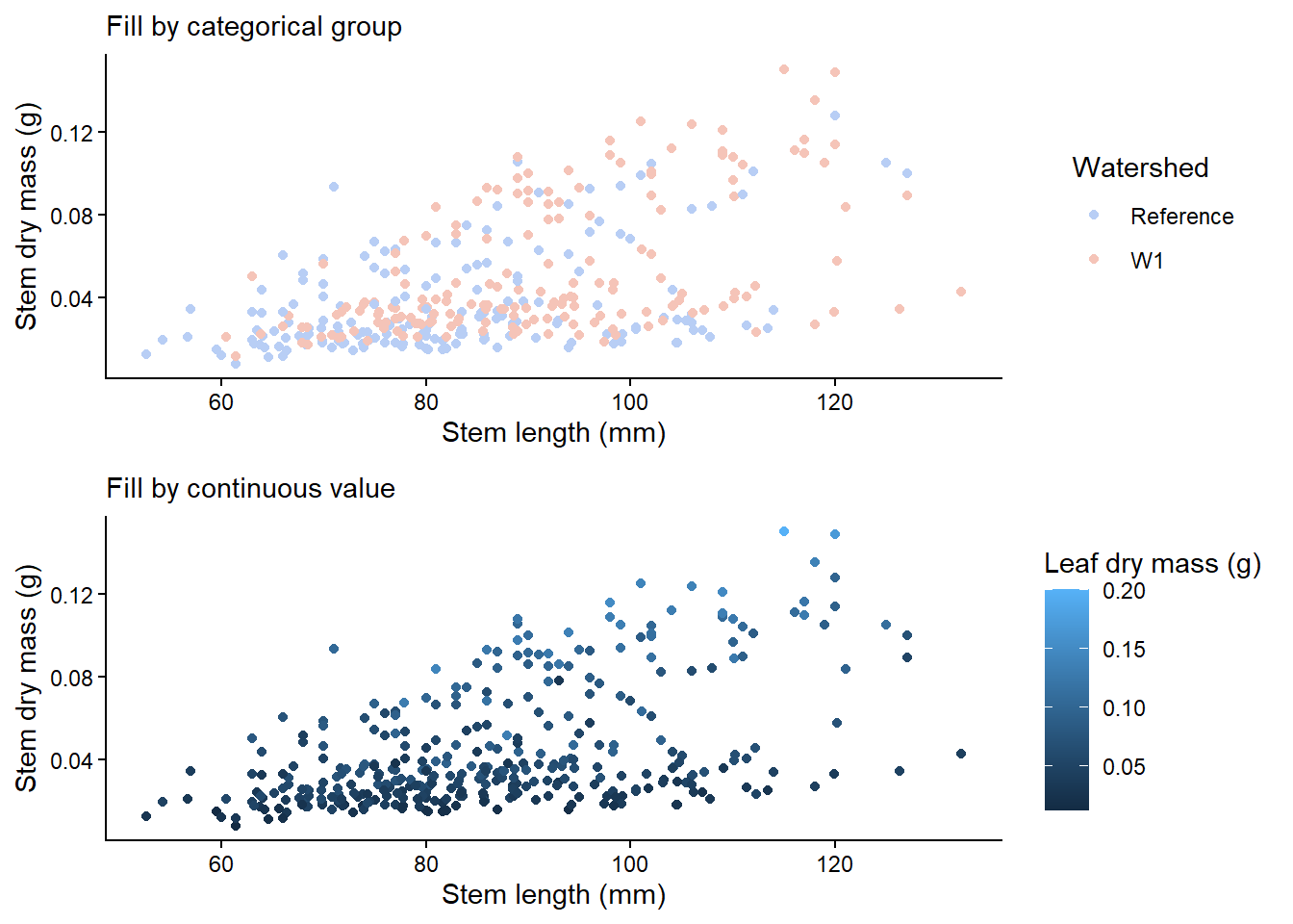 cat_plot <- plant_task_clean_data %>%ggplot(aes(x = stem_length, y = stem_dry_mass, colour = watershed)) +geom_point() +# Modify herescale_colour_manual(values =c("#B8CEF5", "#F5C4B8")) +labs(subtitle ="Fill by categorical group",x ="Stem length (mm)", y ="Stem dry mass (g)",colour ="Watershed") +theme_classic()con_plot <- plant_task_clean_data %>%ggplot(aes(x = stem_length, y = stem_dry_mass, colour = leaf_dry_mass)) +geom_point() +labs(subtitle ="Fill by continuous value",x ="Stem length (mm)", y ="Stem dry mass (g)",colour ="Leaf dry mass (g)") +theme_classic()cowplot::plot_grid(cat_plot, con_plot, ncol =1, align ="v")