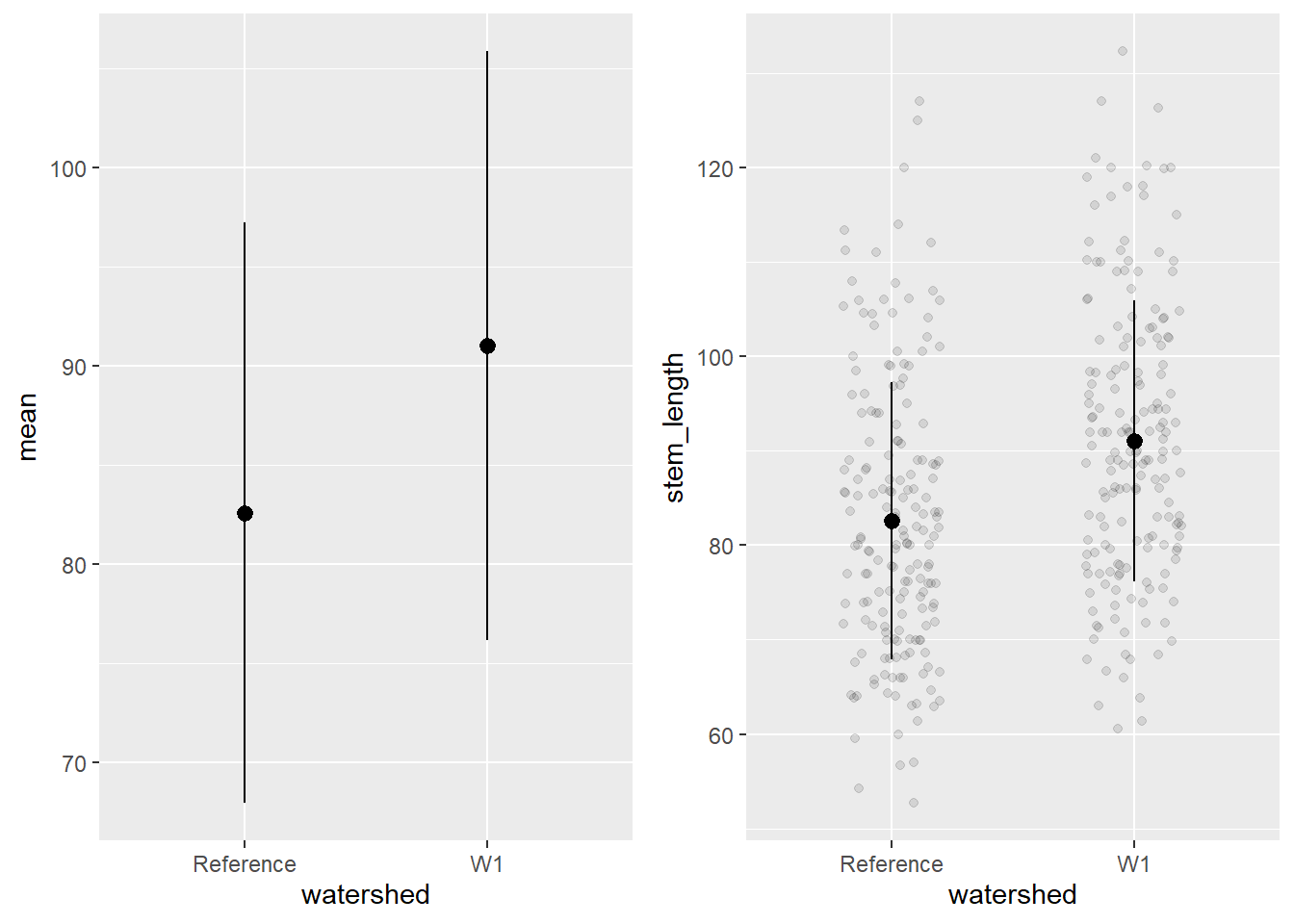 # mean +/- sd only.mean_plot <- plant_sum %>%ggplot() +geom_pointrange(aes(x = watershed, y = mean, ymin = mean-sd, ymax = mean+sd))# including raw dataraw_plot <-ggplot() +geom_jitter(data = plant_task_clean_data, aes(x = watershed, y = stem_length), alpha =0.1, position =position_jitter(0.2)) +#raw datageom_pointrange(data = plant_sum, aes(x = watershed, y = mean, ymin = mean-sd, ymax = mean+sd))cowplot::plot_grid(mean_plot, raw_plot, ncol =2, align ="v")