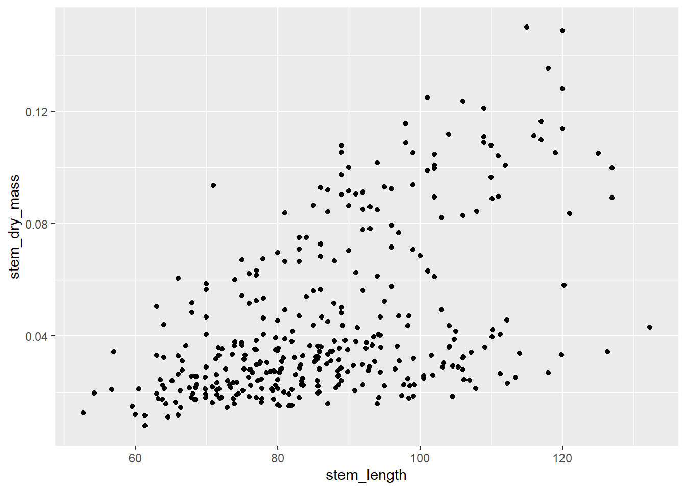 plant_task_clean_data %>%ggplot(aes(x = stem_length, y = stem_dry_mass)) +geom_point()