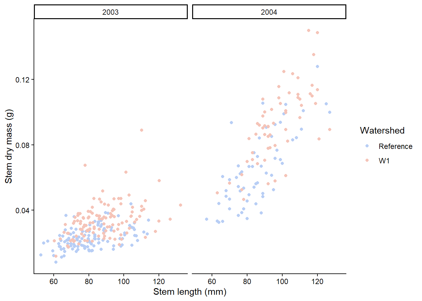 # Split in horizontal directionplant_task_clean_data %>%ggplot(aes(x = stem_length, y = stem_dry_mass, colour = watershed)) +geom_point() +scale_colour_manual(values =c("#B8CEF5", "#F5C4B8")) +labs(x ="Stem length (mm)", y ="Stem dry mass (g)",colour ="Watershed") +theme_classic() +# Modify herefacet_grid(. ~ year)