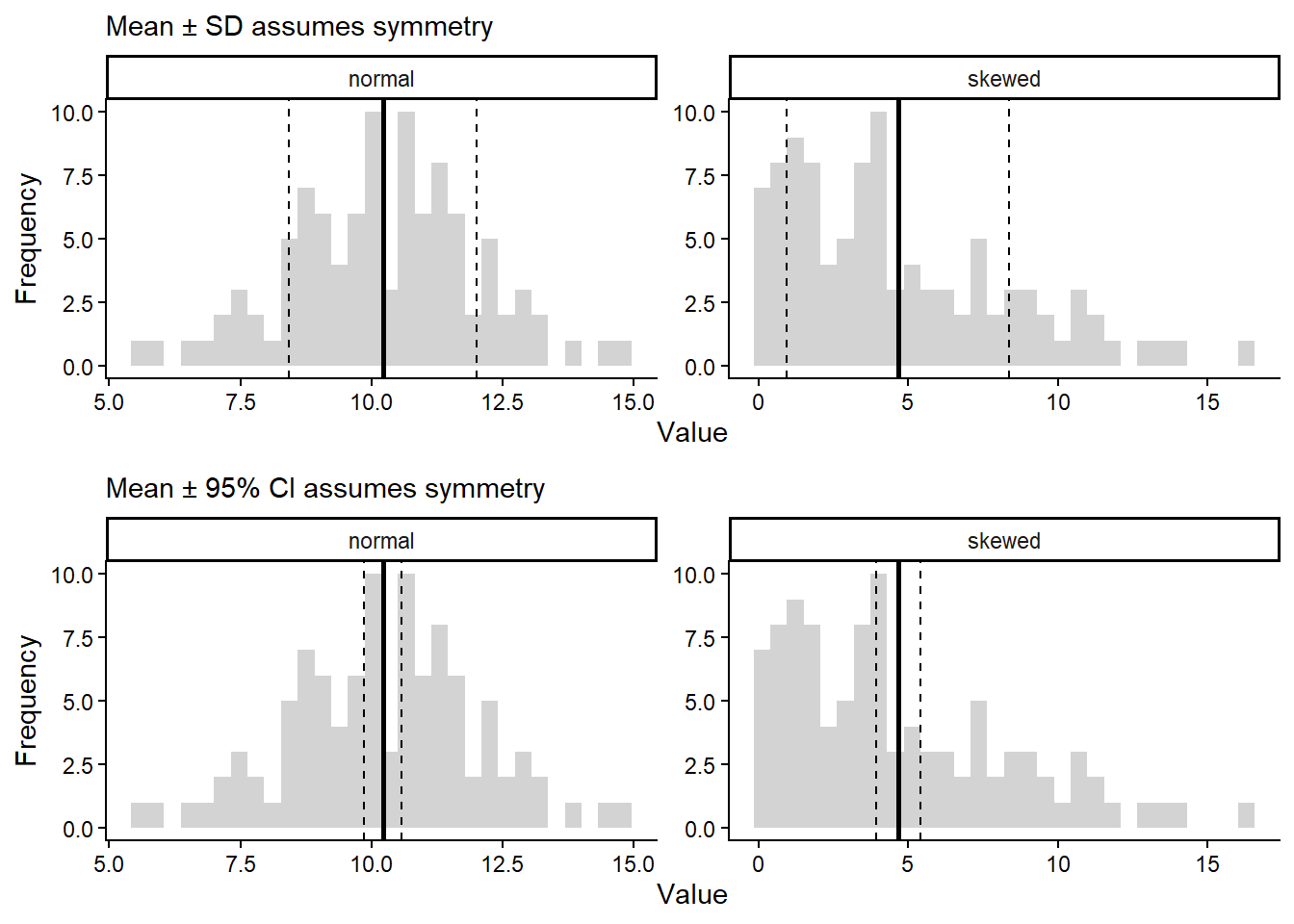 Here is a visualisation on SD (top) and 95% CI (bottom) for normal skewed data.