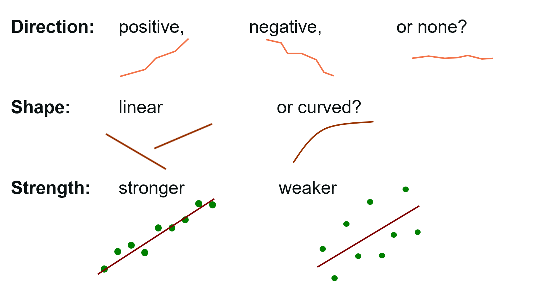 The figure below provides an overview of three key descriptions we should include when presenting any scatterplot. Additionally, if extremes or potential outliers are present these should also be described and checked for validity (data entry mistake, measurement errors, units not a part of the population of interest, etc).