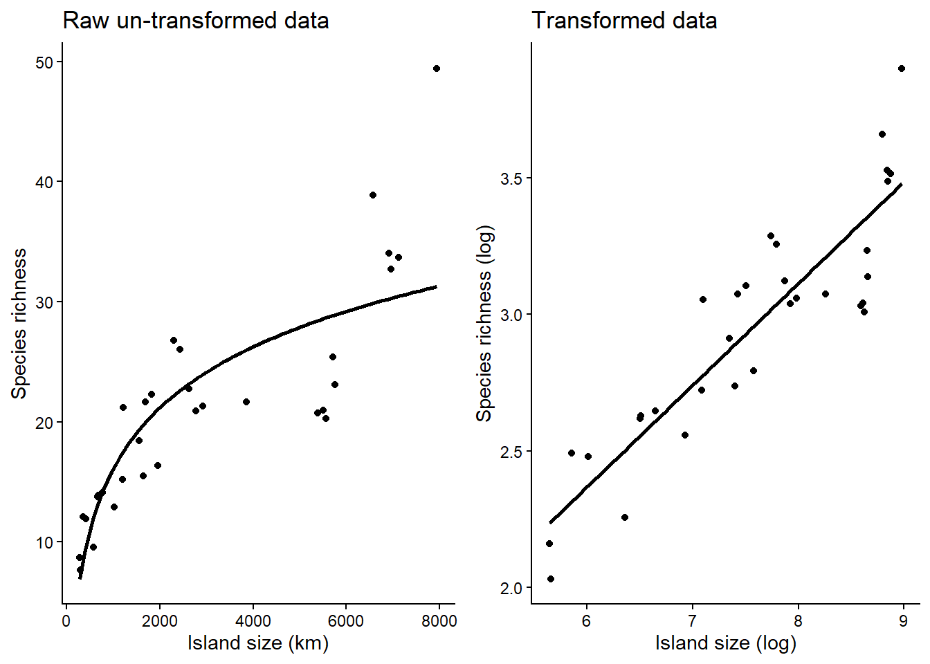 If you tried to fit island size with species richness, it wont work well because the relationship is curved (left figure). If you log transform island size (island_area_log) and species richness (species_richness_log), the relationship looks more linear (right figure).