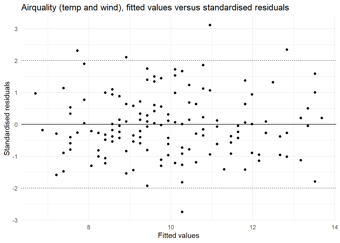 labs(title = "Airquality (temp and wind), fitted values versus standardised residuals",