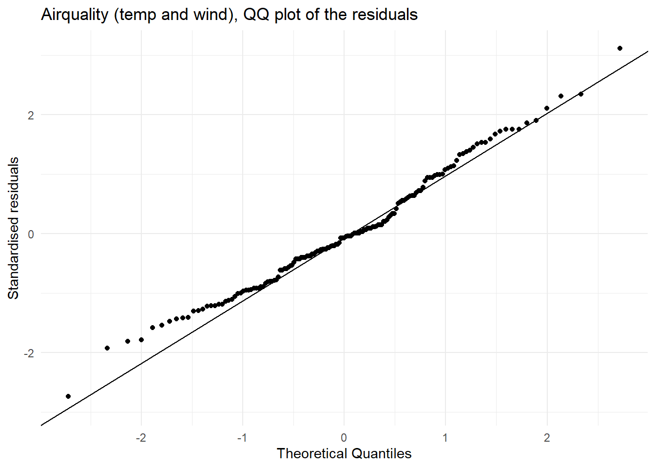 labs(title = "Airquality (temp and wind), QQ plot of the residuals",