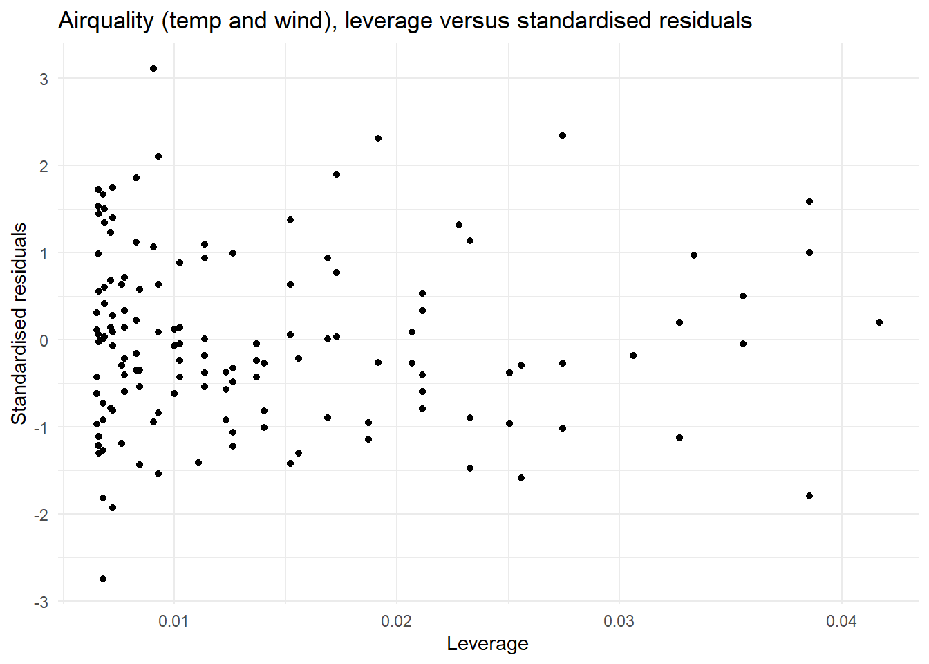 labs(title = "Airquality (temp and wind), leverage versus standardised residuals",