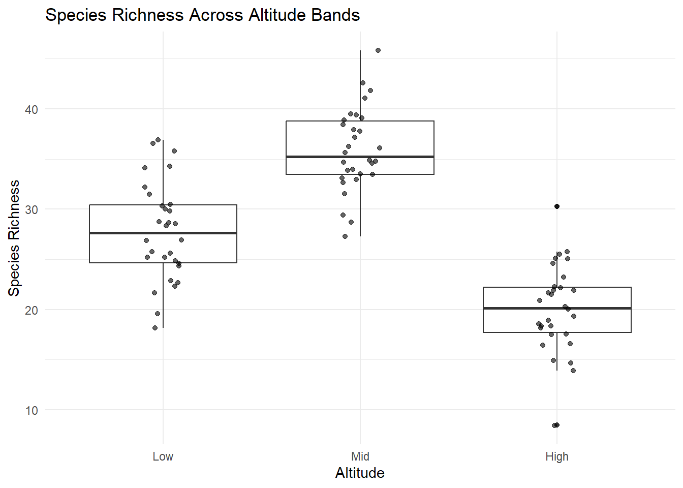 mutate(Altitude = factor(Altitude , levels = c("Low", "Mid", "High")))As this data is simulated for the purposes of learning we will focus on the process running one-way ANOVA in R and learning how to write an interpretation.