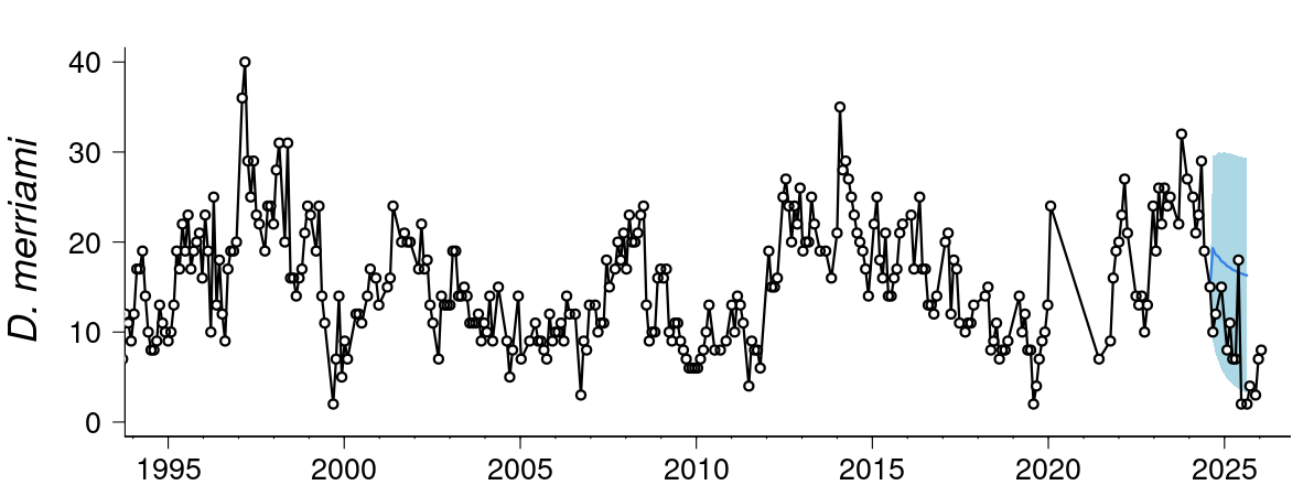 Forecasting: More advanced forescasting models can deal with temporal autocorrelation, lagged effects, non-Gaussian data and missing observations, measurement, error, time-varying effects, non-linearities, and multi-series clustering. Some common time-series models that incorporates uncertainty in forecasting (i.e stochastic processes) includes include random walk, autoregressive, autoregressive integrated moving average, and exponential smoothing. Here is an example live forecast for the population and community dyanmics of desert rodents.