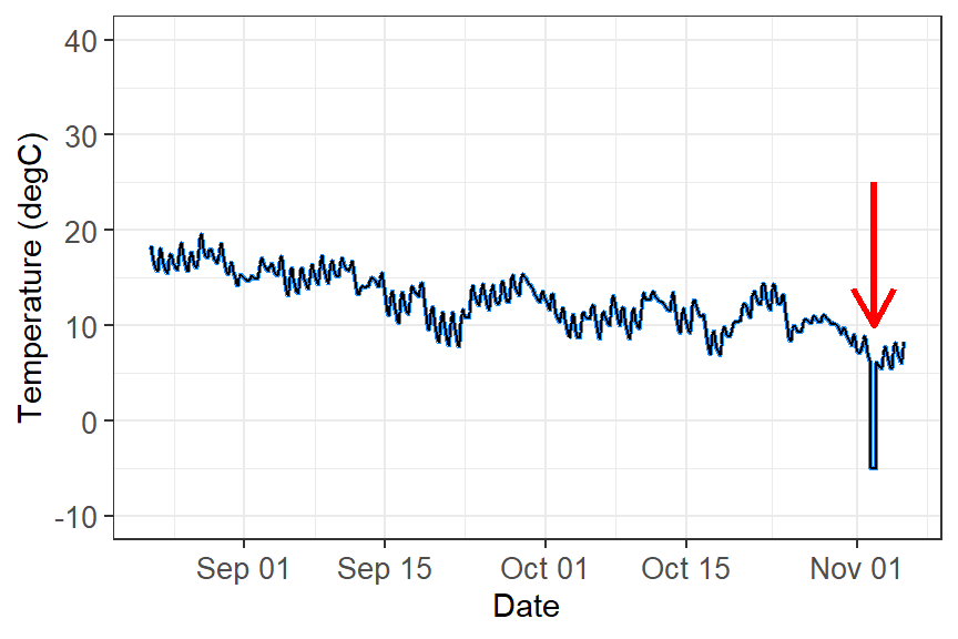 Bad data can happen for a number of reasons. Your logger may have been damaged, or exposed to something that artificially changed the data. The logger might have a software bug. An example dataset with bad recorded data (likely equipment issue) shown in this figure.