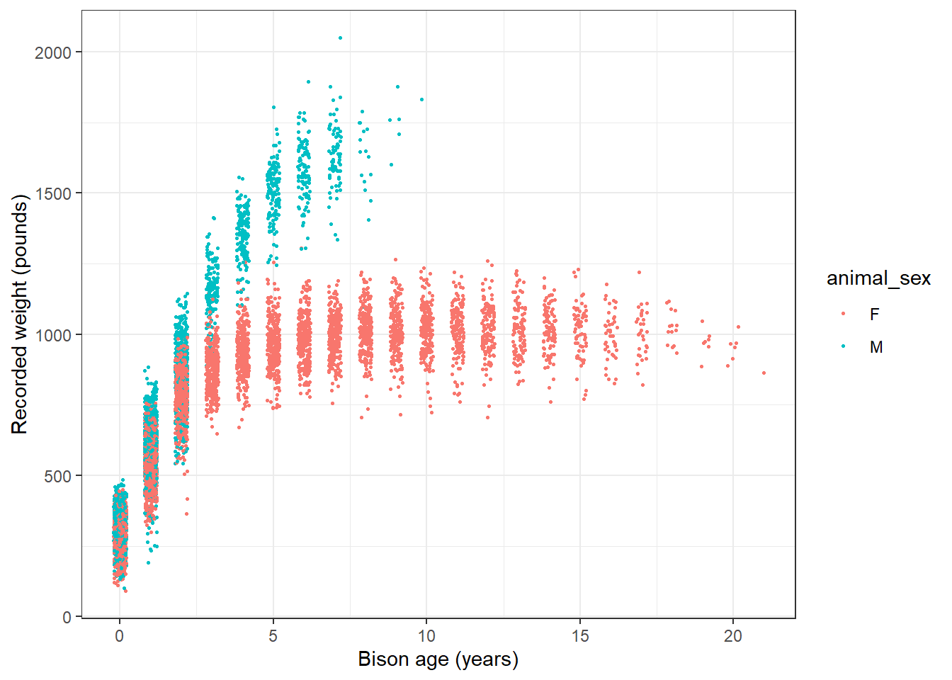 Isolate just the female bison (note that this starts from the dataset knz_bison_age created above that contains the calculated bison age, stored as animal_age):