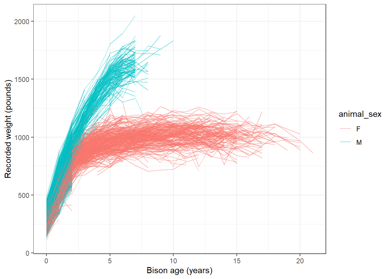 ggplot(data = knz_bison_age, aes(x = animal_age, y = animal_weight, group = animal_code)) +
