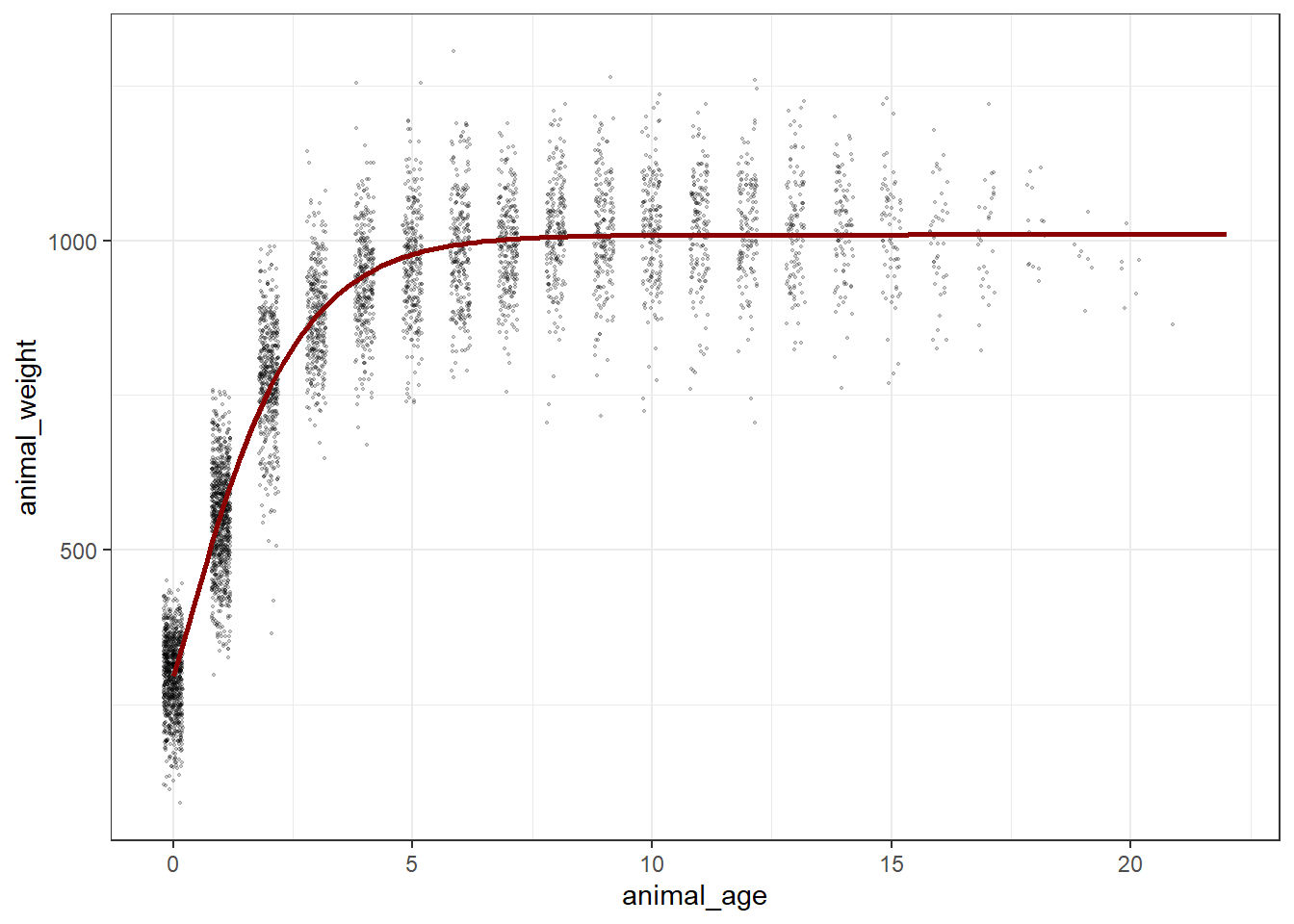filter(animal_sex == "F")Use nls to estimate parameters (note: add trace = TRUE to print iterative estimates):