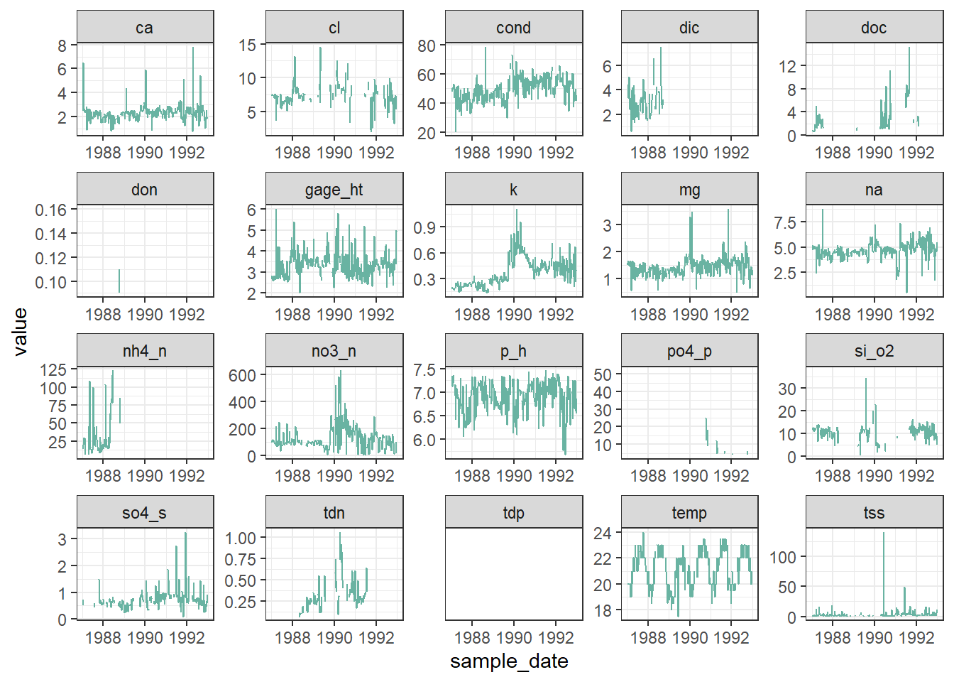 We are not sure if all the chemicals and water quality indicators have been monitored over the same time period, or if their value will also show strong variations at the end of 1989. To explore this we will transform our data frame into long format so we can use ggplot2::facet_wrap() to quickly plot all observed stream chemistry variables at once. Note we are using the scales = free option since the concentrations (and units) vary greatly among the different variables.
